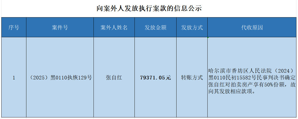 香坊区人民法院关于向案外人发放执行案款的信息公示